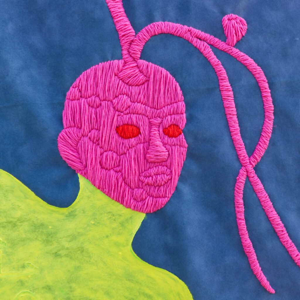 Dans sa série Bots, Penzkofer utilise la broderie et le collage de tissus pour explorer les interfaces entre la vie végétale, animale et humaine, ainsi que la robotique. Les œuvres oscillent entre peinture et relief, image et sculpture, entre effroi et beauté. Les visages représentés sont inspirés de robots humanoïdes, présentant des caractéristiques à la fois humaines et mécaniques. Le traitement égal de la laine, appliqué sur les visages, dissout leurs différences et rompt avec la rigueur mécanique des motifs par le travail manuel et les irrégularités inhérentes. Des structures organiques émergent des têtes, évoquant des plantes ou des bois de cerf.