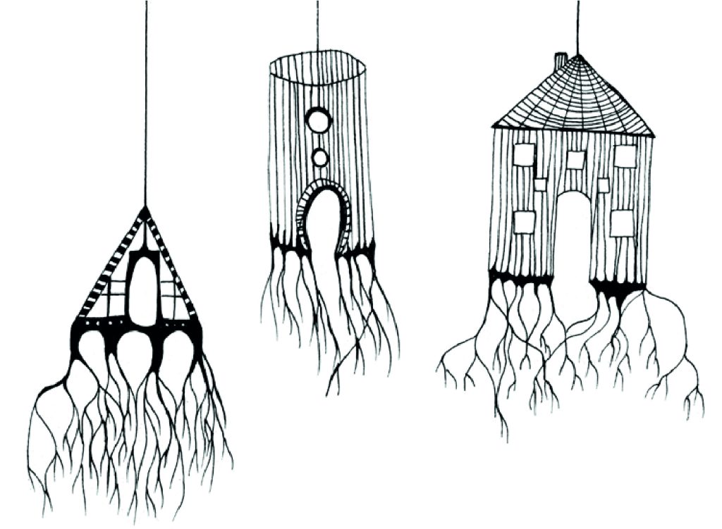 Imaginons un instant, que nos maisons archétypales, quittent la terre et deviennent des maisons en suspension. Cataclysmes, impesanteurs, dérèglements climatiques ? La cause est incertaine mais les maisons racines forment dorénavant des îlots aériens. Les enracinements de nos maisons sont alors visibles et proposent des formes rhizomatiques oniriques.