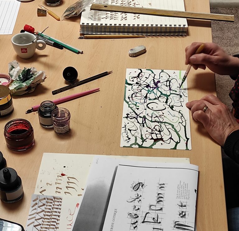 Après avoir appris à manier la plume pour tracer des pleins et des déliés, nous testerons de nouveaux outils pour déstructurer les écritures et faire une composition abstraite. Parce que la calligraphie n’est pas simplement écrire mais aussi dessiner, tracer, explorer et lâcher prise, tous ceux qui ne se sentent pas à l’aise avec leur écriture seront les bienvenus !