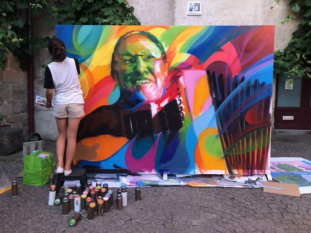 Création d’une œuvre en live par Sêma Lao. Portrait d’un accordéoniste grand format réalisé à la bombe aérosol dans un style vif et coloré.
